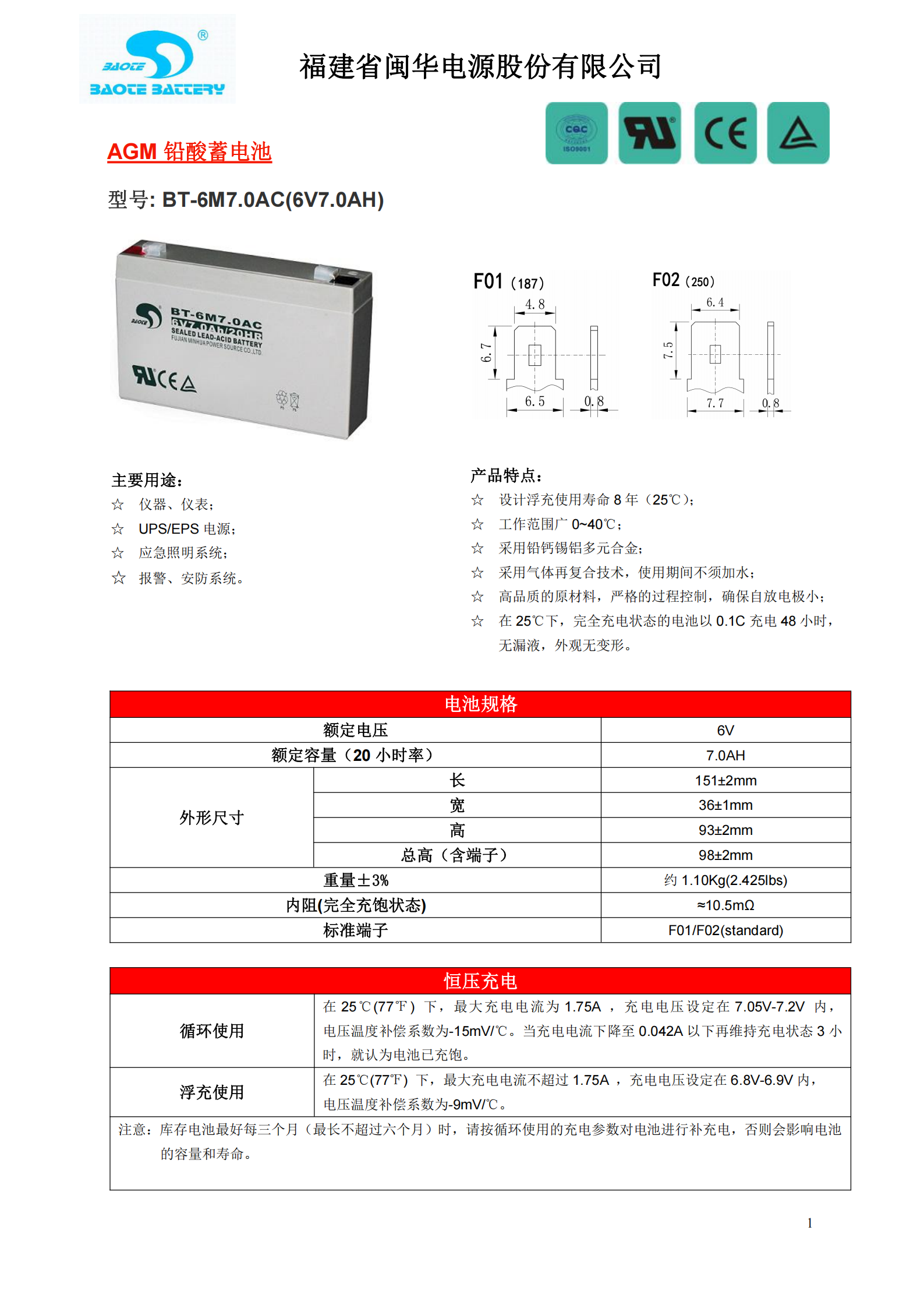 BT-6M7.0AC型号表明这是一款6伏特电压、7安时容量的蓄电池,其紧凑的尺寸和轻量化设计使其特别适合安装在空间有限的玩具和便携式设备中。该电池采用密封式结构设计,具有防漏液特性,使用安全可靠,即使在儿童玩具应用中也能确保使用安全。
