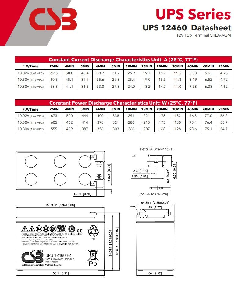 希世比CSB蓄电池12V460W报警系统电源UPS12460F2FR是一款专为报警系统和UPS不间断电源设计的蓄电池产品。该电池采用12伏电压设计,额定功率为460瓦,能够为各类安防报警设备提供稳定可靠的电力支持。产品型号中的UPS12460F2FR表明这是CSB蓄电池系列中适用于UPS系统的专用型号,具有深度放电保护和快速充电特性。