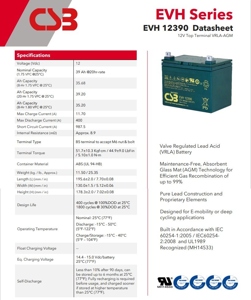 CSB蓄电池EVH12390是一款由台湾希世比公司生产的铅酸蓄电池产品,其技术参数为12伏39安时容量。该型号蓄电池采用阀控式密封设计,具有免维护、防漏液、高循环寿命等特点,适用于不间断电源系统、通信设备、安防系统等后备电源应用场景。产品符合国际电工委员会IEC标准,在25摄氏度环境下可提供稳定的放电性能,其正极板采用铅钙合金栅板技术,有效提升电池的耐腐蚀性和深循环能力。该蓄电池出厂前经过严格的容量测试和充放电检测,确保每只电池达到标称容量要求,典型使用寿命为3-5年,具体寿命取决于实际使用环境和充放电频次。建议用户在安装使用时保持环境通风干燥,避免阳光直射,并定期检查电池端电压状态。