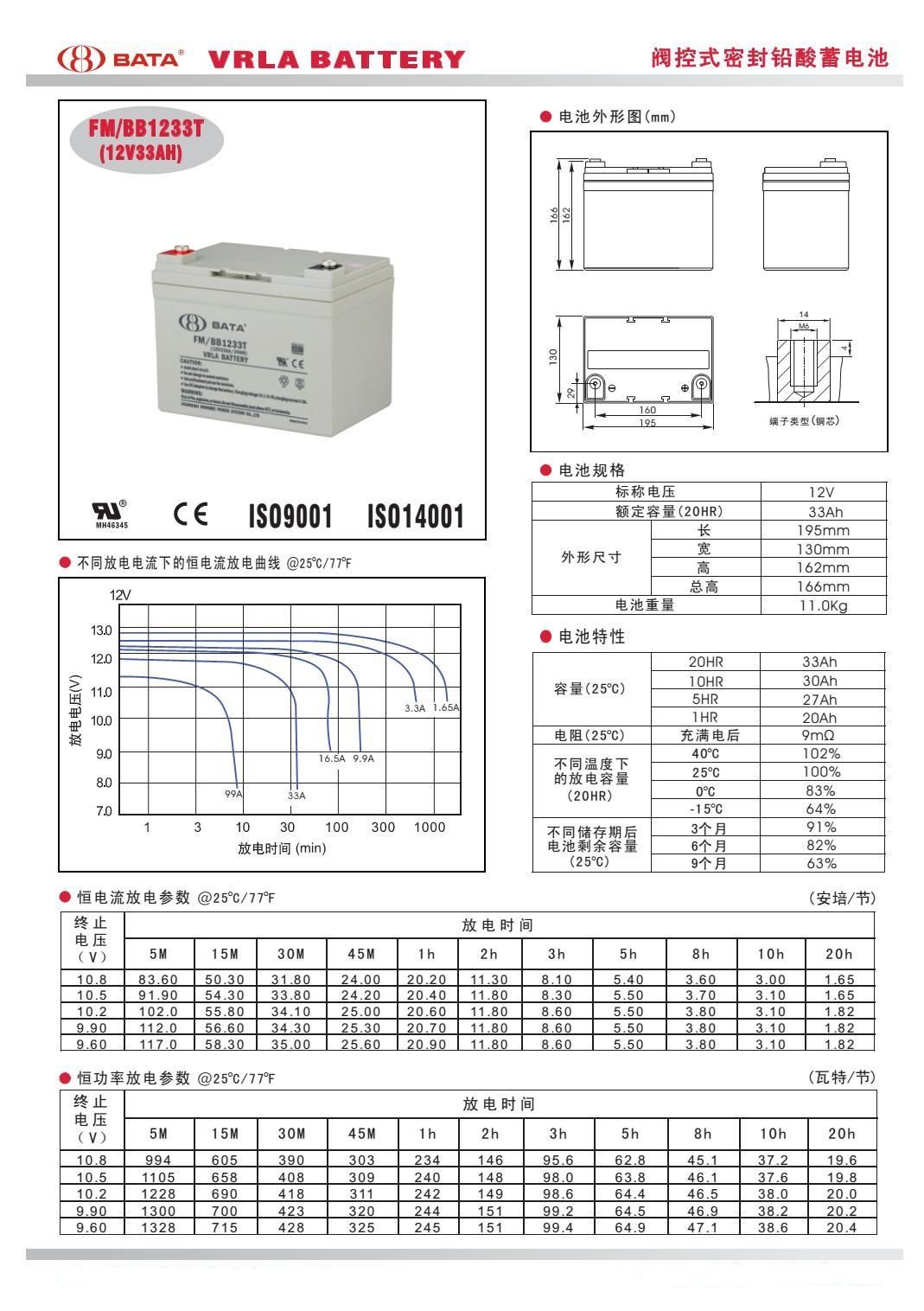 BATA鸿贝蓄电池FM/BB1233T是一款12伏33安时的铅酸蓄电池产品。该电池采用阀控式密封设计,具有免维护、安全可靠的特点。其额定电压为12V,额定容量为33AH,适用于中小型UPS不间断电源系统、安防设备、医疗仪器等需要稳定电力供应的场合。
